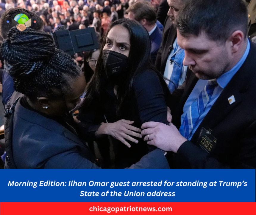 A guest of U.S. Representative Ilhan Omar was arrested Tuesday night after standing and protesting during former President Donald Trump’s State of the Union address at the U.S. Capitol.