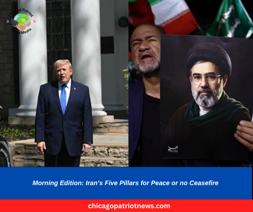 Iran has rejected a U.S.-backed ceasefire proposal, setting five strict conditions for ending the conflict. These include an immediate halt to all Israeli/U.S. attacks and assassinations, guarantees against future conflict, payment of war reparations, an end to hostilities against regional allies, and exclusive Iranian sovereignty over the Strait of Hormuz.