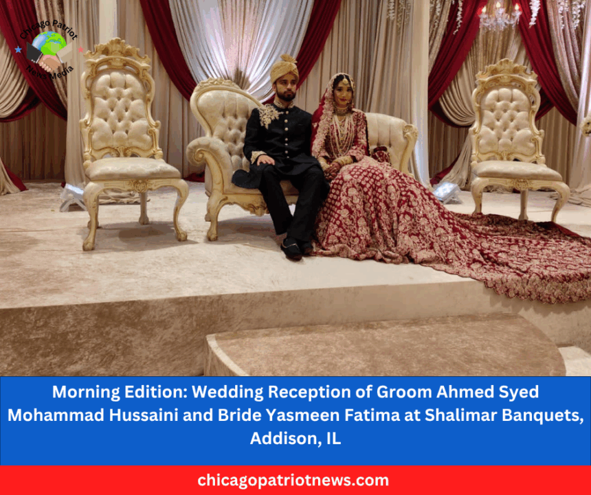 A grand wedding reception was hosted by Mrs and Mr Fasihuddin Qureshi for their daughter Yasmeen Fatima’s wedding with Ahmed Syed Mohammad Hussaini son of Syed Mohammad Ather Hussaini. The event took place at the Shalimar Banquets, Addison, IL at 7 pm.