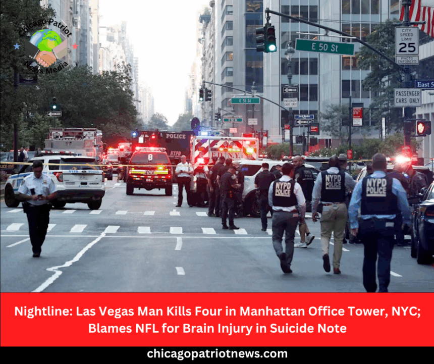 A man who killed four people in a Midtown Manhattan office building left behind a note blaming the National Football League (NFL) for his brain disease, New York Mayor Eric Adams said on Tuesday.